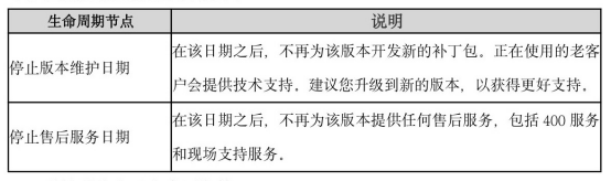 聯(lián)軟科技每年在 12 月份發(fā)布長(zhǎng)期支持的軟件版本,現(xiàn)對(duì)公司產(chǎn)品生命周期管理各時(shí)間節(jié)點(diǎn)明確,如下表格所示: