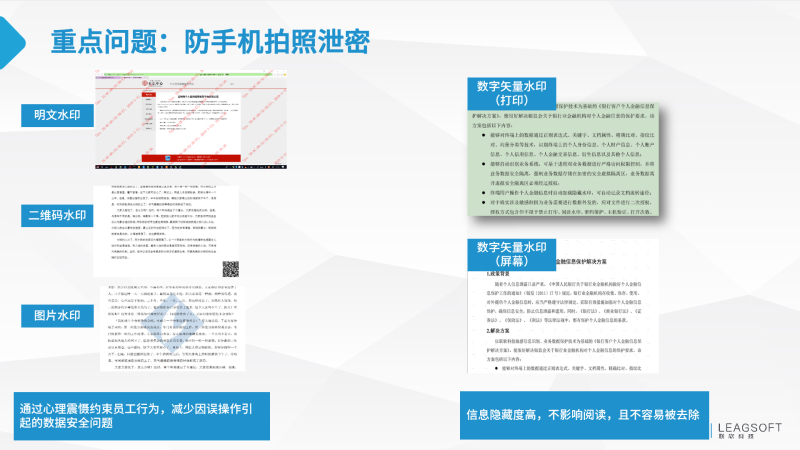“威懾為主”主要是指:對員工主動泄密,以威懾為主。通過多項安全能力(包括文件追蹤、文件DNA、水印等),強化心理震懾的作用。企業(yè)可以借助多種專利水印技術(shù),實現(xiàn)數(shù)據(jù)泄密回溯。同時支持在截屏、拍照、打印時附加明文、隱形等多重形式的水印,通過技術(shù)和管理結(jié)合,一旦泄密可追溯泄密源頭,有效遏制“內(nèi)鬼式”數(shù)據(jù)泄密事件。