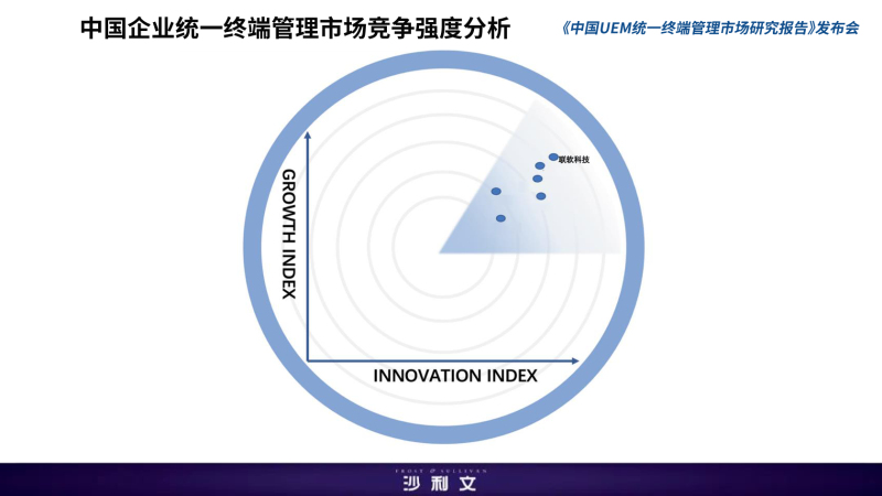同時,郭兆斌先生重點分享了報告的多項研究成果。沙利文通過對中國UEM統(tǒng)一終端管理市場的深度調(diào)研和分析,以及對業(yè)內(nèi)相關企業(yè)、產(chǎn)品競爭力情況的研究和評估,基于創(chuàng)新指數(shù)和增長指數(shù)兩大評價維度,分析中國統(tǒng)一終端管理主流廠商在市場中的競爭力情況,根據(jù)報告顯示,聯(lián)軟科技在中國UEM統(tǒng)一終端管理領域中占據(jù)領導者位置。