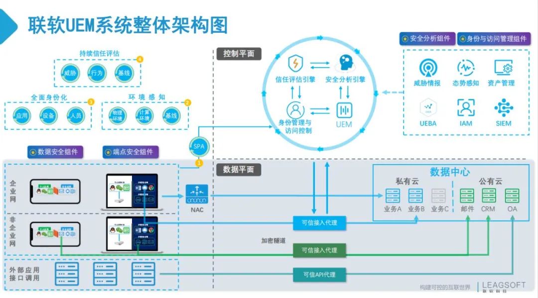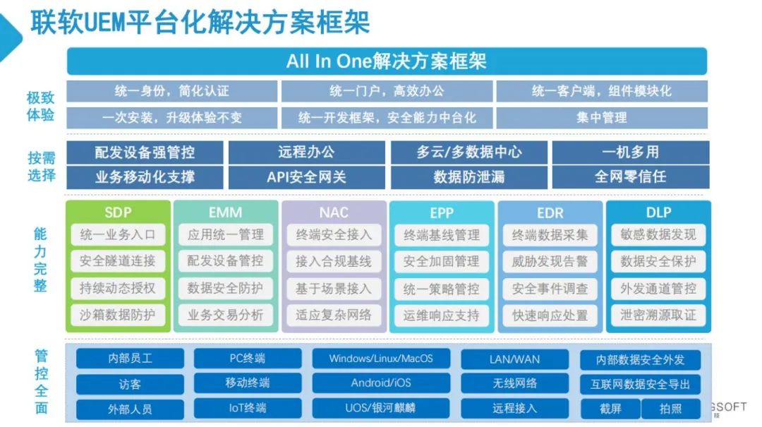 針對這些關(guān)鍵要素,聯(lián)軟是怎么做的呢?任前程分享到,聯(lián)軟科技通過在網(wǎng)絡(luò)安全、云安全、移動安全、數(shù)據(jù)安全等領(lǐng)域的深厚積累與龐大的用戶群體,發(fā)布了基于零信任架構(gòu)的UEM統(tǒng)一終端管理解決方案,一個平臺,統(tǒng)一管理,為政企用戶解決終端統(tǒng)一管控難題。