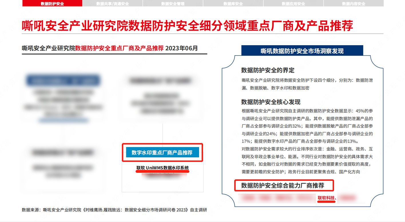 此次入選《數(shù)據(jù)安全細(xì)分市場(chǎng)調(diào)研報(bào)告2023》多個(gè)細(xì)分領(lǐng)域圖譜,并入選多個(gè)重點(diǎn)廠商產(chǎn)品推薦目錄,充分體現(xiàn)了業(yè)界對(duì)聯(lián)軟的認(rèn)可和肯定。