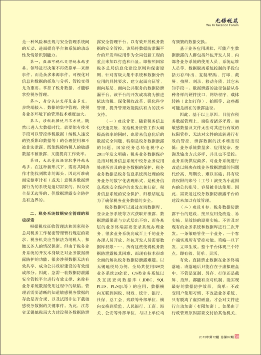 (一)創(chuàng)新意義。稅務(wù)數(shù)據(jù)防泄露平臺作為全國稅務(wù)系統(tǒng)首個專門管控數(shù)據(jù)安全平臺,在技術(shù)創(chuàng)新和管理創(chuàng)新上均有所突破。