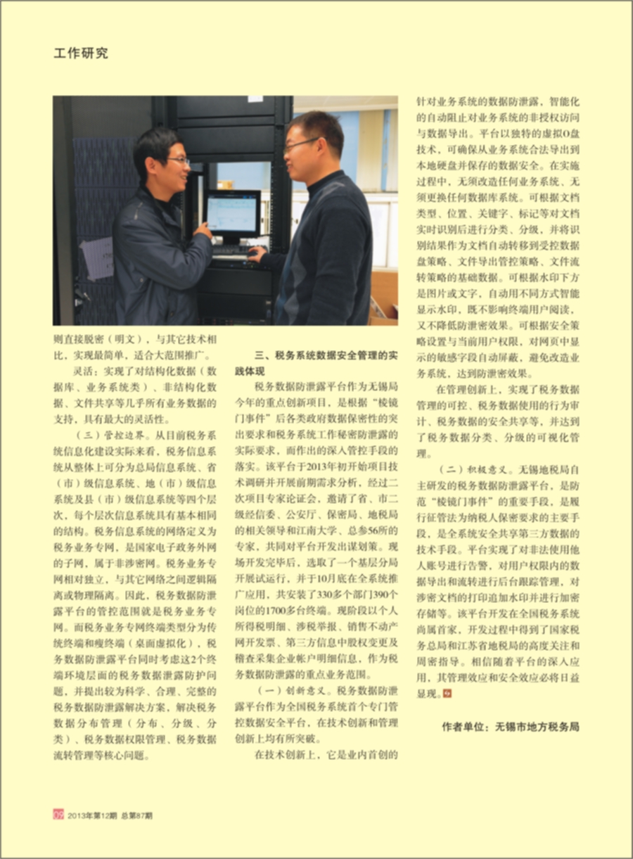 稅務(wù)數(shù)據(jù)防泄露平臺作為無錫局今年的重點(diǎn)創(chuàng)新項目,是根據(jù)“棱鏡門時間”后各類政府?dāng)?shù)據(jù)保密性的突出要求和稅務(wù)系統(tǒng)工作秘密防泄露的實(shí)際要求,而做出的深入管控手段落實(shí)。該平臺于2013年初開始項目技術(shù)調(diào)研并開展前期需求分析,經(jīng)過二次項目專家論證會,邀請了省、市二級經(jīng)信委、公安廳、保密局、地稅局的相關(guān)領(lǐng)導(dǎo)和江南大學(xué)、總參56所得專家,共同對平臺開發(fā)出謀劃策。現(xiàn)場開發(fā)完畢后,選取了一個基層分局開展試運(yùn)行,并于10月底在全系統(tǒng)推廣應(yīng)用,共安裝了330多個部門390個崗位的1700多臺終端。現(xiàn)階段以個人所得稅明細(xì)、涉稅舉報、銷售不動產(chǎn)網(wǎng)開發(fā)票、第三方信息中股權(quán)變更及稽查采集企業(yè)賬戶明細(xì)信息,作為稅務(wù)數(shù)據(jù)防泄露的重點(diǎn)業(yè)務(wù)范圍。