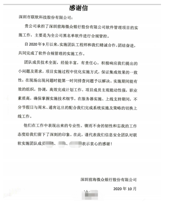 近日,聯(lián)軟科技收到了深圳前海微眾銀行股份有限公司(以下簡稱微眾銀行)發(fā)來的感謝信。
