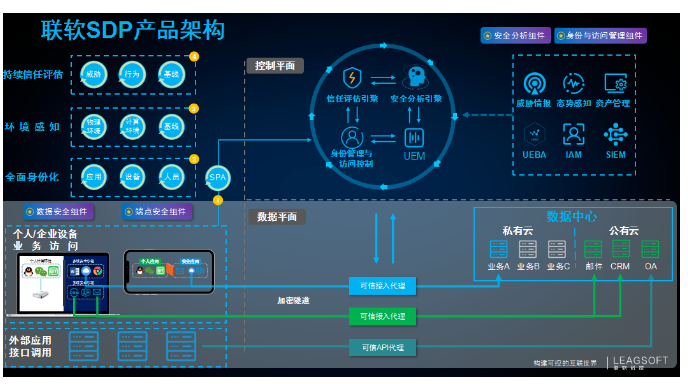 前面已經(jīng)提到,聯(lián)軟早在2019年就開始實踐零信任領(lǐng)域,并推出了UniSDP解決方案,它以零信任理念為基礎(chǔ)、認(rèn)證授權(quán)體系為基石、業(yè)務(wù)安全為核心,實現(xiàn)安全和業(yè)務(wù)的統(tǒng)一。聯(lián)軟UniSDP通過細(xì)粒度的安全訪問控制手段、可視化的策略管理能力與輕量級安全沙箱技術(shù),提供按需、動態(tài)的可信訪問。在實現(xiàn)網(wǎng)絡(luò)隱身、最小授權(quán)的基礎(chǔ)上,保證企業(yè)數(shù)據(jù)安全可控。