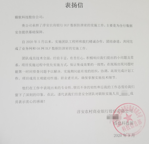 對(duì)于淳安農(nóng)商行發(fā)來(lái)的感謝信,聯(lián)軟科技感到十分的榮幸,并感謝相關(guān)部門(mén)同事在此次項(xiàng)目實(shí)施過(guò)程當(dāng)中給予的各方面支持。