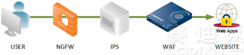 上圖是流量導(dǎo)入網(wǎng)絡(luò)應(yīng)用的過程,我們再來看看攻擊的順序:從NGFW,到IPS,再到WAF(有時(shí)還有緩沖隔層)。當(dāng)攻擊者使用SQL注入查詢數(shù)據(jù)時(shí),表面看起來跟一般的Web頁面訪問沒什么區(qū)別,所以前兩層防火墻并不會(huì)對(duì)它發(fā)出警報(bào)。這意味著,SQL注入會(huì)一路暢通,只有到達(dá)WAF防護(hù)層時(shí),才會(huì)被視作惡意攻擊,因?yàn)镹GFWs和IPSs并不是為網(wǎng)絡(luò)應(yīng)用和數(shù)據(jù)庫所設(shè)。