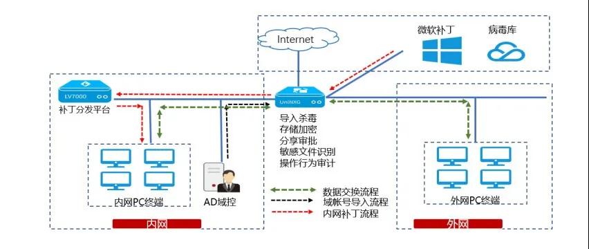 聯(lián)軟UniNXG安全數(shù)據(jù)交換系統(tǒng)部署在醫(yī)院內外網(wǎng)間,支持多網(wǎng)交換,查殺毒、審計審批、文檔追蹤和水印功能,安全解決醫(yī)院網(wǎng)絡隔離、網(wǎng)間及網(wǎng)內數(shù)據(jù)傳輸、交換、共享/分享、存儲等問題。