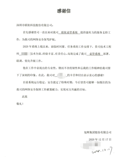 近日,聯(lián)軟科技收到了旭輝集團(tuán)股份有限公司(旭輝集團(tuán))發(fā)來(lái)的感謝信。信中對(duì)我司聯(lián)軟桌管系統(tǒng)的服務(wù)支持工作給予了高度評(píng)價(jià)。以下為感謝信: