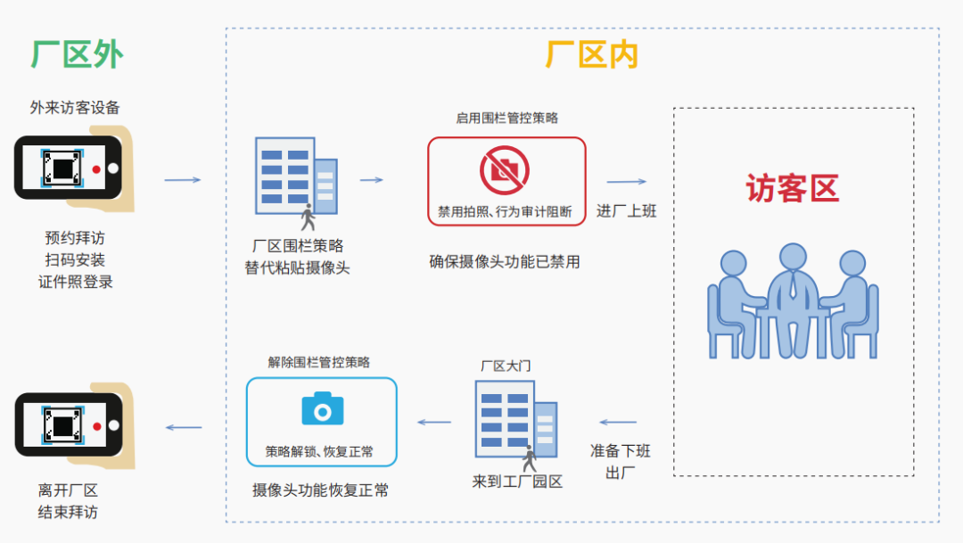 智能手機的不斷普及給人們的工作和生活帶來了極大的便捷,隨手拍照也成了很多人的習(xí)慣。然而在制造業(yè)中,設(shè)計圖紙、工藝路線、面板配料、生產(chǎn)線數(shù)據(jù)等屬于行業(yè)的核心商業(yè)機密,一旦泄露將造成極大的風(fēng)險和損失。傳統(tǒng)的攝像頭管控手段(如貼紙,袋裝等)管控效果不佳,經(jīng)常被繞過。為了避免泄密,有些企業(yè)采取嚴(yán)堵的方式,不讓攜帶任何電子設(shè)備進(jìn)入核心區(qū)域,但這種做法在移動互聯(lián)網(wǎng)已經(jīng)滲透到人們生活的方方面面的現(xiàn)實下,嚴(yán)重影響了員工或者來訪者的體驗而被擯棄。企業(yè)需要更有效的技術(shù)手段對移動設(shè)備的攝像頭進(jìn)行管控。