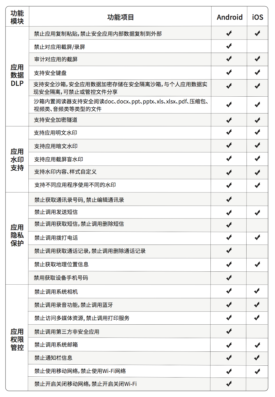 同時,聯(lián)軟科技打造的整體的企業(yè)移動辦公支撐平臺(以下簡稱UEM)致力于將自身安全能力通過接口SDK的方式提供給到企業(yè)的APP,這些APP只需要簡單集成SDK就可以擁有以下安全能力,詳細(xì)功能如下: