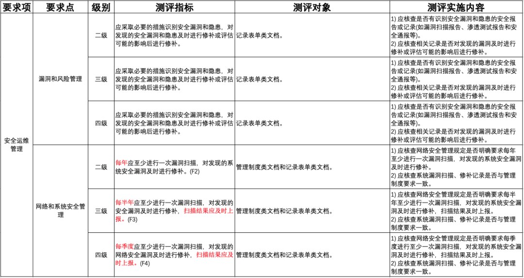 本標(biāo)準(zhǔn)對安全運(yùn)維管理的漏洞和風(fēng)險(xiǎn)管理、網(wǎng)絡(luò)和系統(tǒng)安全管理中漏洞管理要求如下: