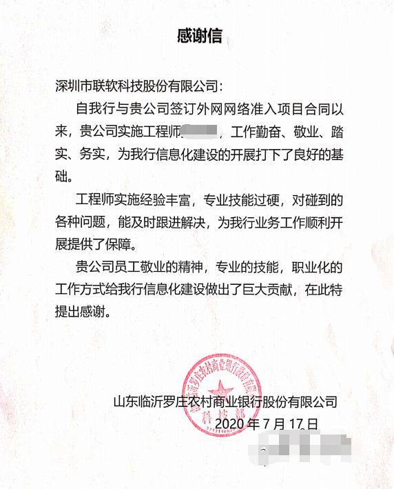 近日,聯(lián)軟科技收到了山東臨沂羅莊農(nóng)村商業(yè)銀行股份有限公司(羅莊農(nóng)村商業(yè)銀行)發(fā)來的感謝信。