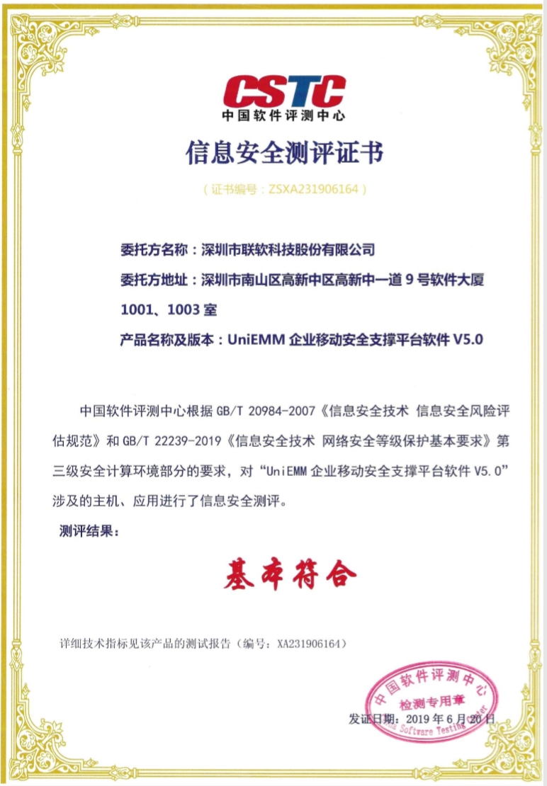聯(lián)軟科技作為安全行業(yè)從業(yè)者,深知安全合規(guī)的重要性,一直積極響應(yīng)國(guó)家安全合規(guī)要求。因此聯(lián)軟科技UniEMM在等保新的安全規(guī)范推出之初就立刻積極申請(qǐng)中國(guó)軟件測(cè)評(píng)中心參照等保三級(jí)安全要求的信息安全測(cè)評(píng),一次性通過該安全測(cè)試,在產(chǎn)品安全性上得到測(cè)評(píng)機(jī)構(gòu)的高度認(rèn)可。