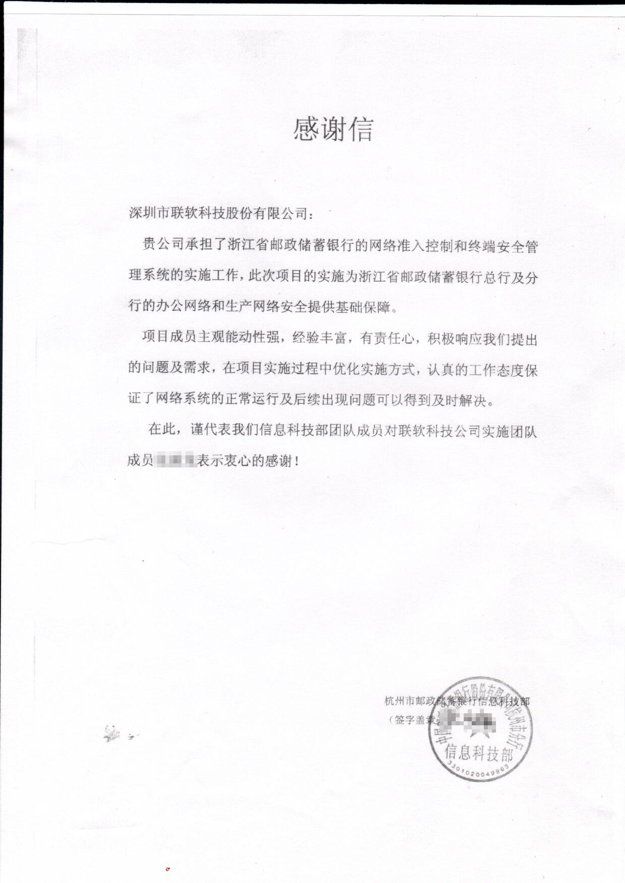 對于浙江郵儲銀行(杭州分行)發(fā)來的感謝信,聯(lián)軟科技也感到十分的榮幸,并感謝浙江郵儲銀行(杭州分行)相關部門同事在此次項目實施過程當中給予的各方面支持。