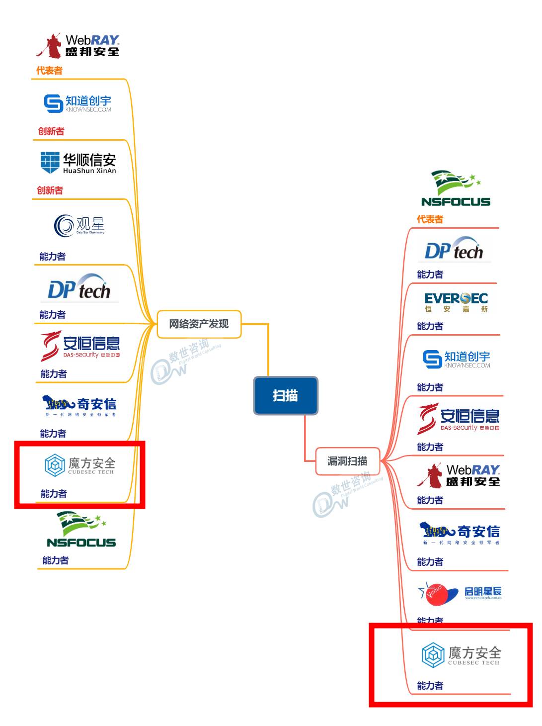 能力圖譜將信息基礎(chǔ)環(huán)境、業(yè)務(wù)應(yīng)用場(chǎng)景和網(wǎng)絡(luò)安全保障劃分為八個(gè)維度,每個(gè)維度又劃分成不同的細(xì)分領(lǐng)域并一直對(duì)應(yīng)到各領(lǐng)域的優(yōu)秀安全能力提供者,力求全面、清晰的反映網(wǎng)絡(luò)安全各細(xì)分領(lǐng)域,并突出安全能力者,為國家部門、行業(yè)用戶、研究機(jī)構(gòu)和資本機(jī)構(gòu)提供參考。魔方安全憑借強(qiáng)勁的技術(shù)和市場(chǎng)能力,成為“通用概念”-“掃描”中的網(wǎng)絡(luò)資產(chǎn)發(fā)現(xiàn)和漏洞掃描兩大方向的行業(yè)能力者。