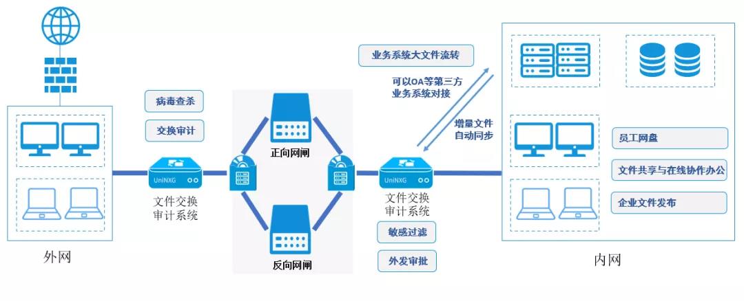 以聯(lián)軟科技UniNXG為核心的跨網(wǎng)數(shù)據(jù)安全交換解決方案,能很好保障客戶內(nèi)部傳輸操作方便性及數(shù)據(jù)安全性。該方案包括以下內(nèi)容: