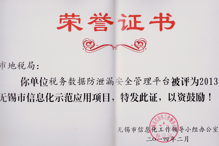 聯(lián)軟與無錫地稅局合作開發(fā)的“稅務(wù)數(shù)據(jù)防泄露安全管理平臺”獲表彰
