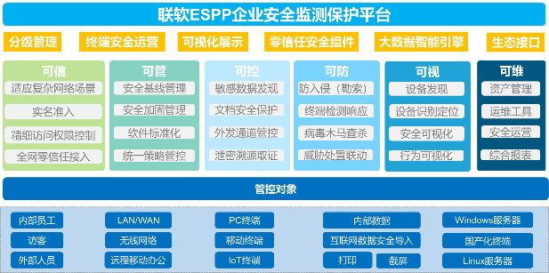 基于醫(yī)院現(xiàn)有終端信息化能力,以聯(lián)軟主機(jī)監(jiān)控與審計(jì)系統(tǒng)為基礎(chǔ)的《醫(yī)院內(nèi)網(wǎng)終端安全一體化解決方案》,通過(guò)一套系統(tǒng),實(shí)現(xiàn)醫(yī)院內(nèi)外網(wǎng)桌面終端的資產(chǎn)管理、安全管理、桌面管理、安全運(yùn)維、外設(shè)管理、網(wǎng)絡(luò)接入控制,在保障終端安全的基礎(chǔ)上統(tǒng)一化管理及運(yùn)維,減少運(yùn)維工作。