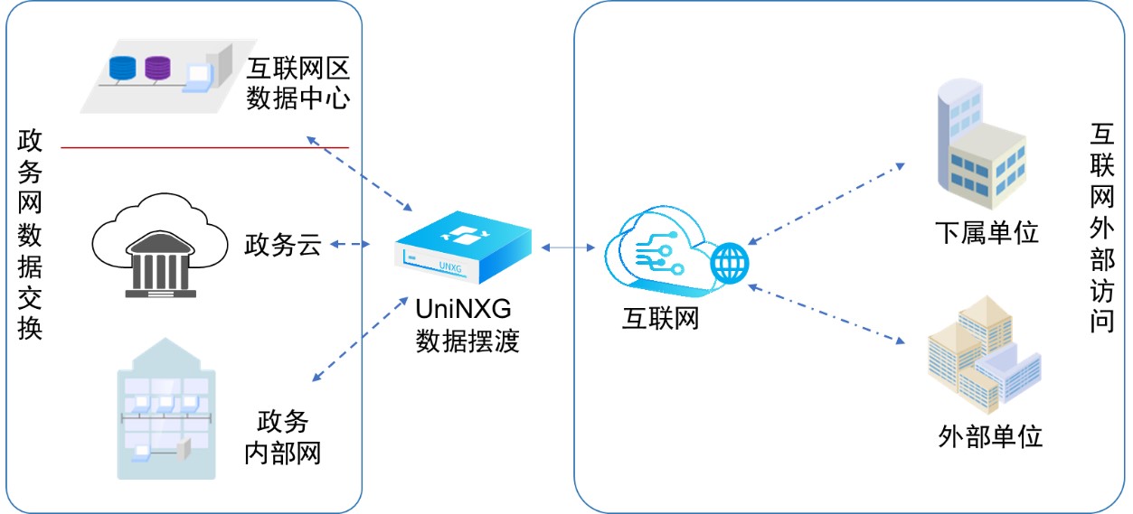 本方案以聯(lián)軟UniNXG數據安全擺渡平臺為主,能夠為各級政務部門內部多張邏輯隔離網間的數據交換提供安全的解決方案,部署簡單,可通過一套實現(xiàn)多網交換效果。